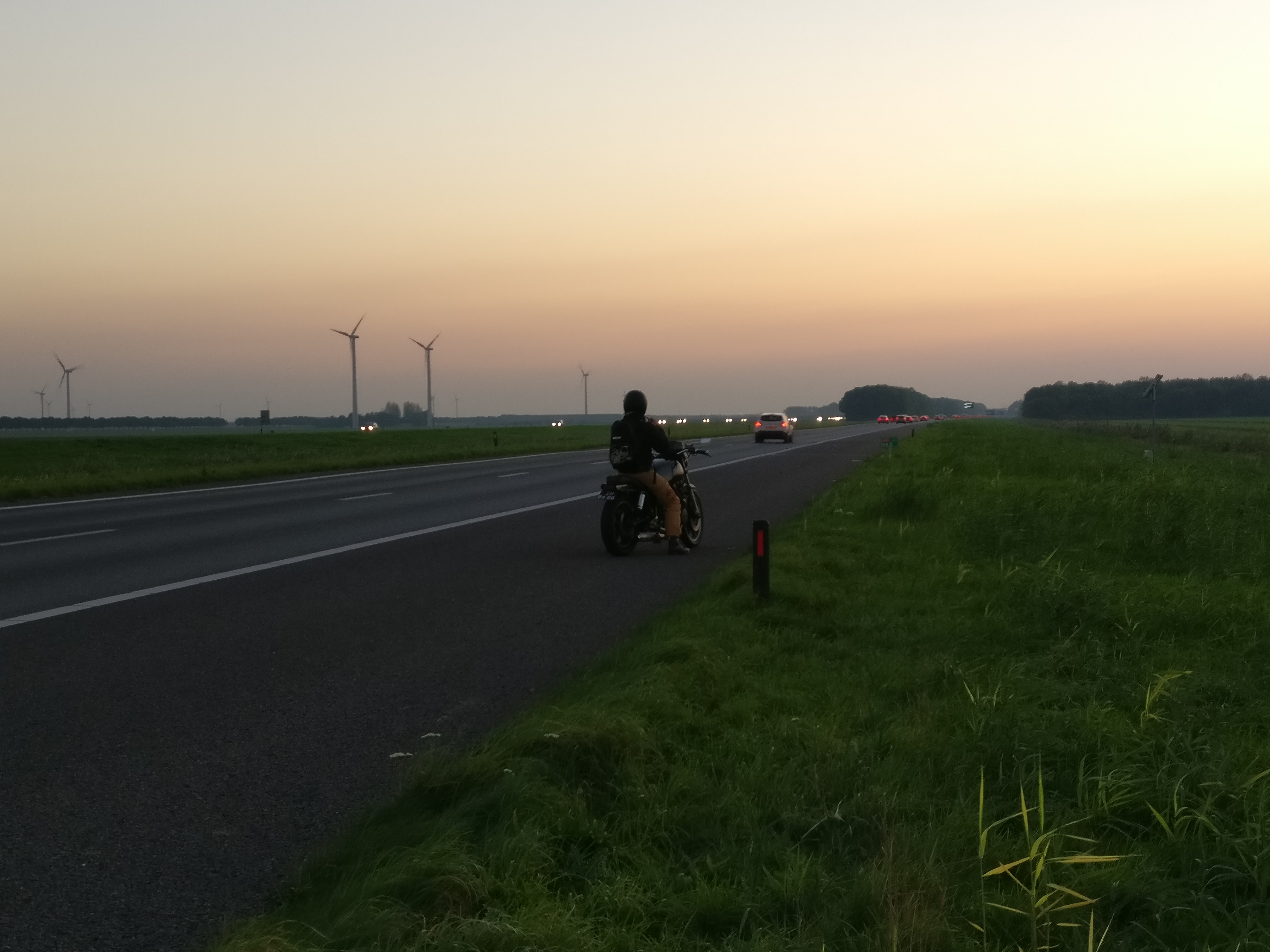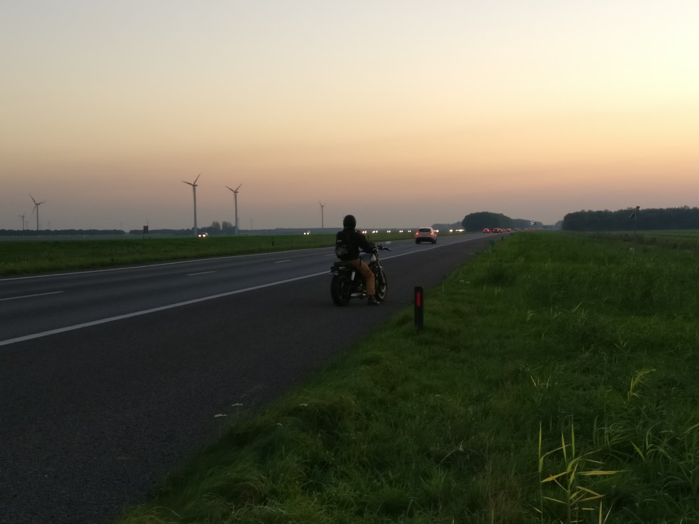 We enter the highway on the other side for the last 45 minutes home to Amersfoort and then disaster strikes. Bumblebee already has some hick ups starting the engine getting worser by the end of the day. While driving the left lane of the highway with 130 km/h suddenly Bumblebee loses all power. I feel it’s wrong and immediately make my way to the emergency lane. Safely there I ring the road assistance (ANWB Wegenwacht) and while waiting with my husband in the grass at a safe distance a motorcyclist on an old-timer stops and asks if he can help. He quickly gives some pointers what it could be and is on his way again after he learns we already have assistance on the way. This is really what distinguishes bikers from car drivers. There is a great sense of brotherhood to help each other out.
