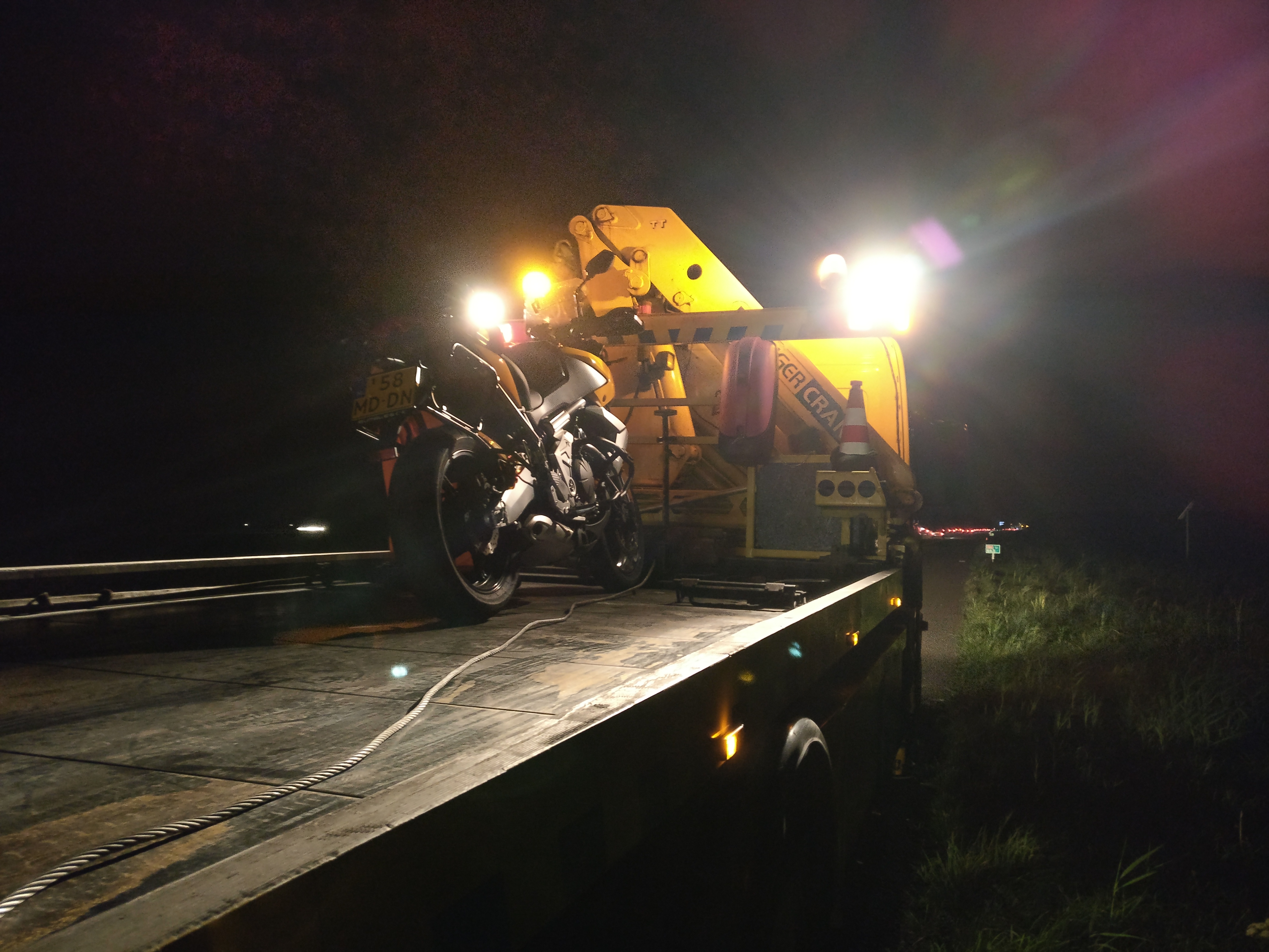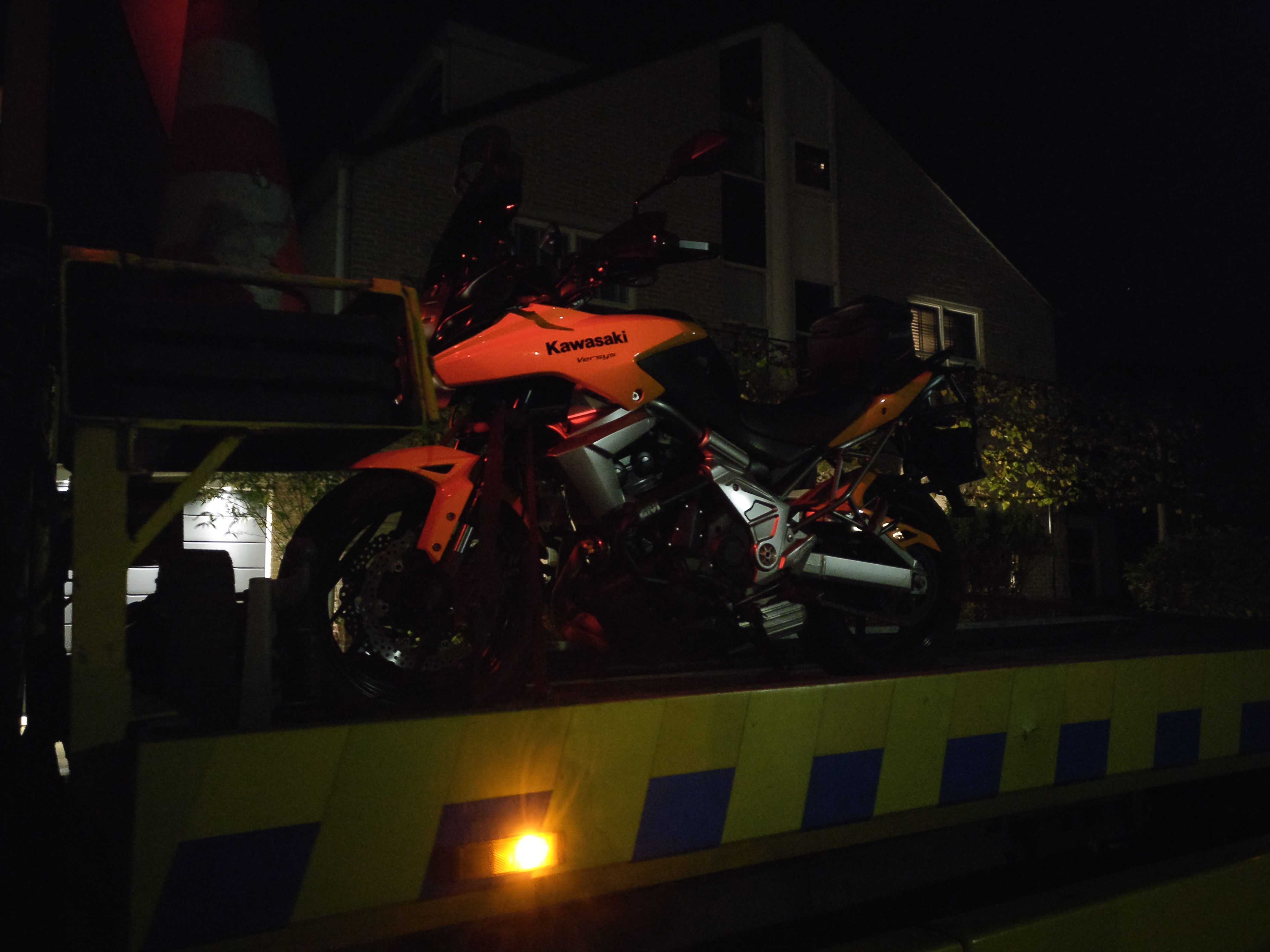 The assistance arrives and concludes the same. It is too dangerous to fix the bike here and it needs more time to fix the cause which probably is the sensor or fuel pump. The tow truck is called and half an hour later Bumblebee is towed and we drop him off at my best friend who will fix him again when spare parts arrive. It is such a horrific site seeing Bumblebee on the tow truck. But he will be fine again soon. To be continued…