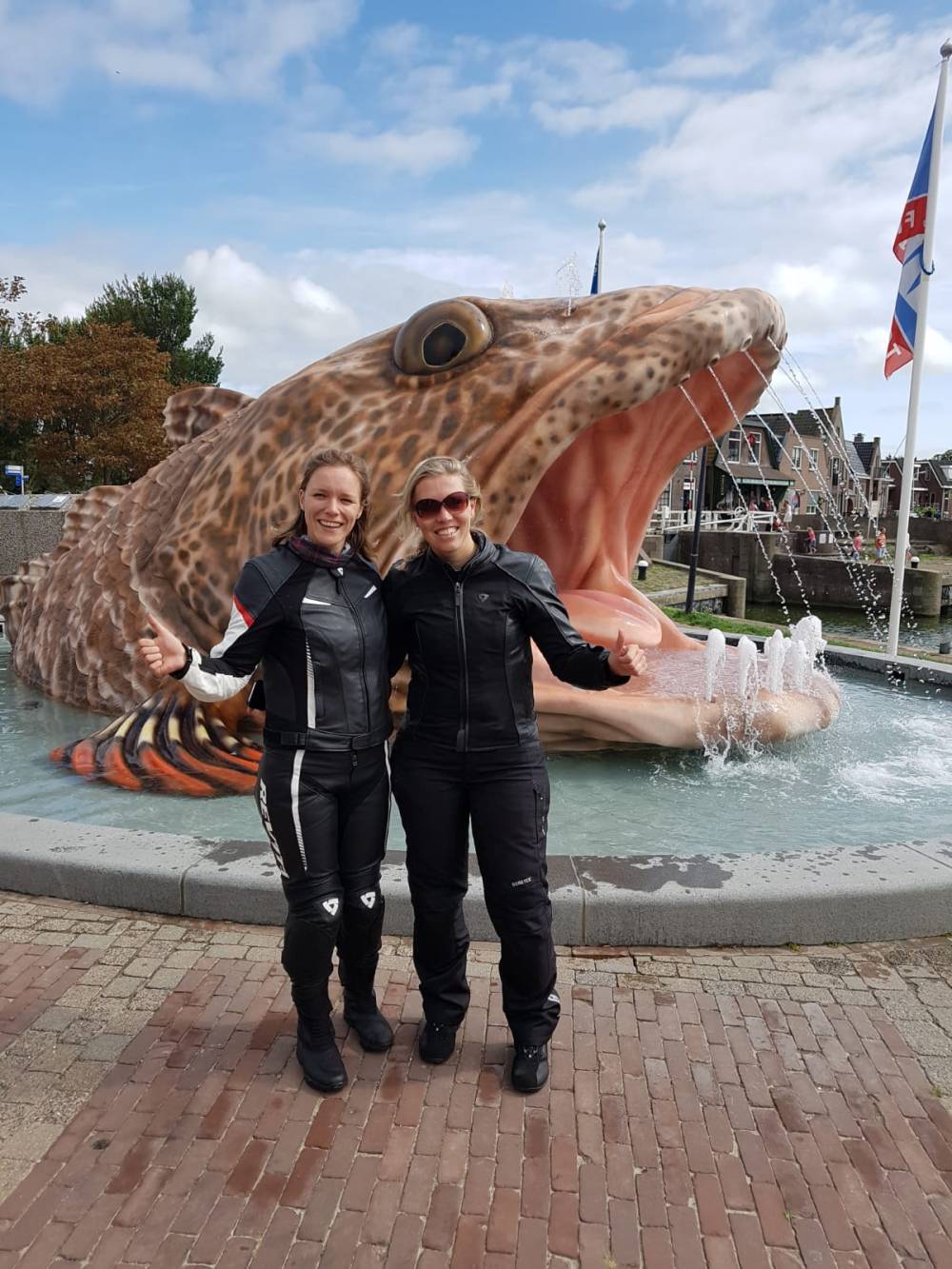 De volgende dag gaan we weer op pad met als eerste stop de lokale bakker Elsinga om een ontbijtje te scoren. De bakkersdame vindt ons maar stoer zo samen op de motoren. We vragen om een kleine verpakking suikerbrood dat in onze tanktassen past, maar ze stelt voor het kwart suikerbrood direct in plakjes te snijden en in twee verpakkingen te doen. Superlief en nu past ons ontbijtje prima staat in de tassen. We rijden met het suikerbrood en chocoladebroodjes naar de dijk waar we de dijk op klauteren en de pier aflopen naar de walvis fontein. Bij de fontein staat een man die ook op de fiets naar Franeker op weg is. Hij vertelt dat de fontein om de 7 minuten spuit, maar zo ontdekken we met wisselende sterkte en tijdsduur.