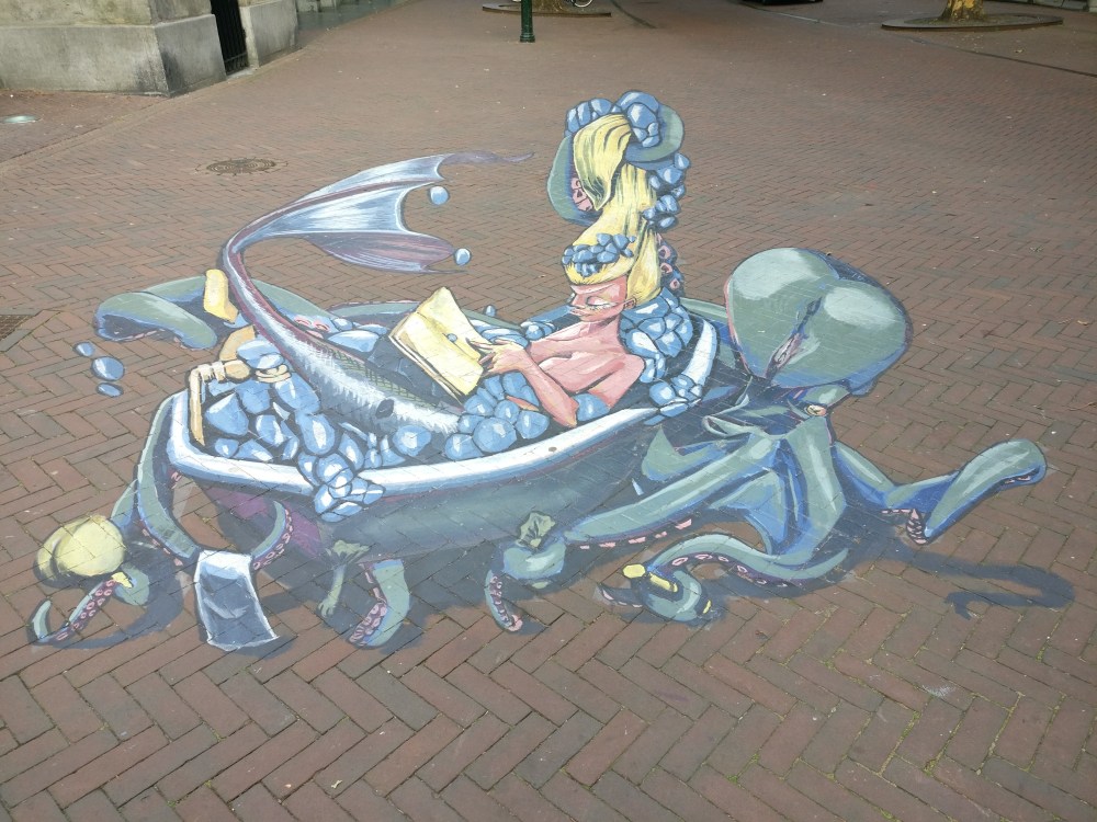 Bolsward heeft een hele mooie fontein van een bronzen vleermuis voor een kerk met glazen dak waar alleen de buitenmuren nog staan na een verwoestende brand. Aan de achterkant van de vleermuis zit een trappetje. We klauteren omhoog en laten ons kieken door een jongen die daar met een ander stel is met een vriendin waarvan we ons afvragen hoe nep je kunt zijn, want werkelijk alles aan haar lijkt door een chirurg te zijn bewerkt. Jammer dat een mens zichzelf zo toe laat takelen om een onnatuurlijk ideaalbeeld na te streven. We komen later in Harlingen een 3D stoeptekening tegen van een zeemeermin in bad die ons aan haar doet denken.