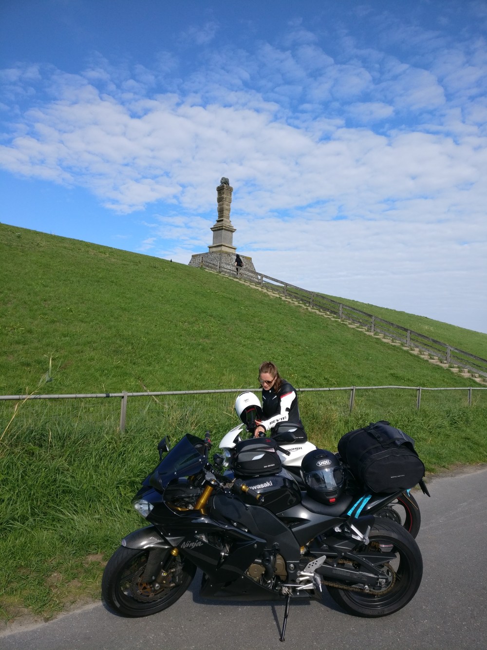 Hoe dichter we bij Leeuwarden komen hoe drukker het verkeer wordt en bij het station staan we even stil. Dan komen de hoofden van de fontein in zicht aan een groot plein aan onze rechterhand waar we de motoren pontificaal voor de fontein zetten en een man ons op de foto zet. We drinken wat op het terras en gaan weer huiswaarts over de snelweg. Echt een aanrader om te doen! Zie mijn Instagram voor meer foto’s en deze fotofilm