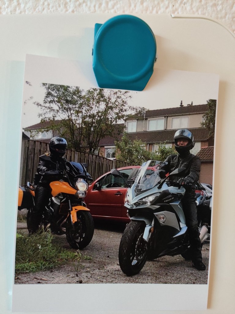 Albums zijn leuk om door te bladeren en ook altijd dankbaar om bij bezoek te laten zien, maar ik vind het ook leuk om een prikbord of whiteboard vol te prikken met foto’s. Daar kun je lekker vaak naar kijken als je er langs loopt en je kunt ook eenvoudig de kiekjes omwisselen. Ik vind de Polaroidfoto’s altijd een heel leuk ontwerp om te zien, maar bij gebrek aan ruimte om op de motor een Polaroidcamera mee te zeulen, maak ik altijd al mijn foto’s met mijn mobieltje. Het is ongelooflijk hoe goed de kwaliteit van die foto’s tegenwoordig is en hoeveel opties je hebt. En het voordeel is dat de foto’s direct naar mijn Google foto’s gaan, zodra ik wifi heb. Mocht mijn mobieltje sneuvelen, zoek raken of gestolen worden, ben ik niet al mijn foto’s kwijt.