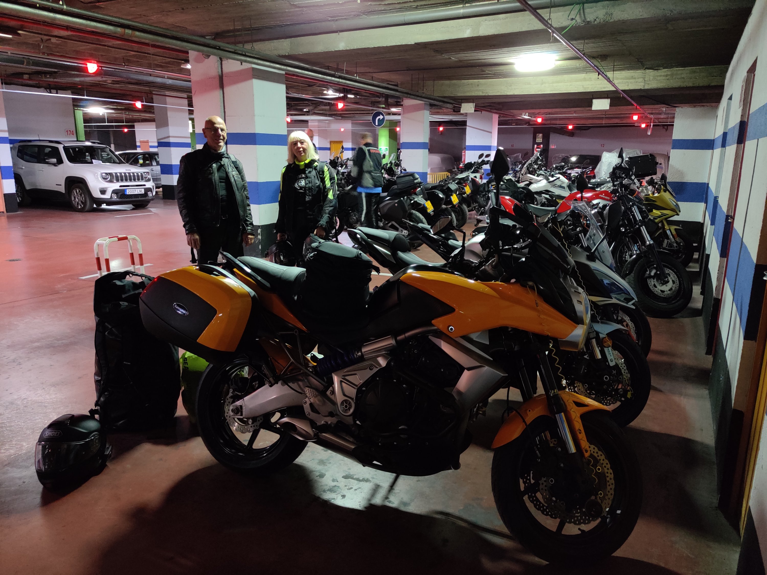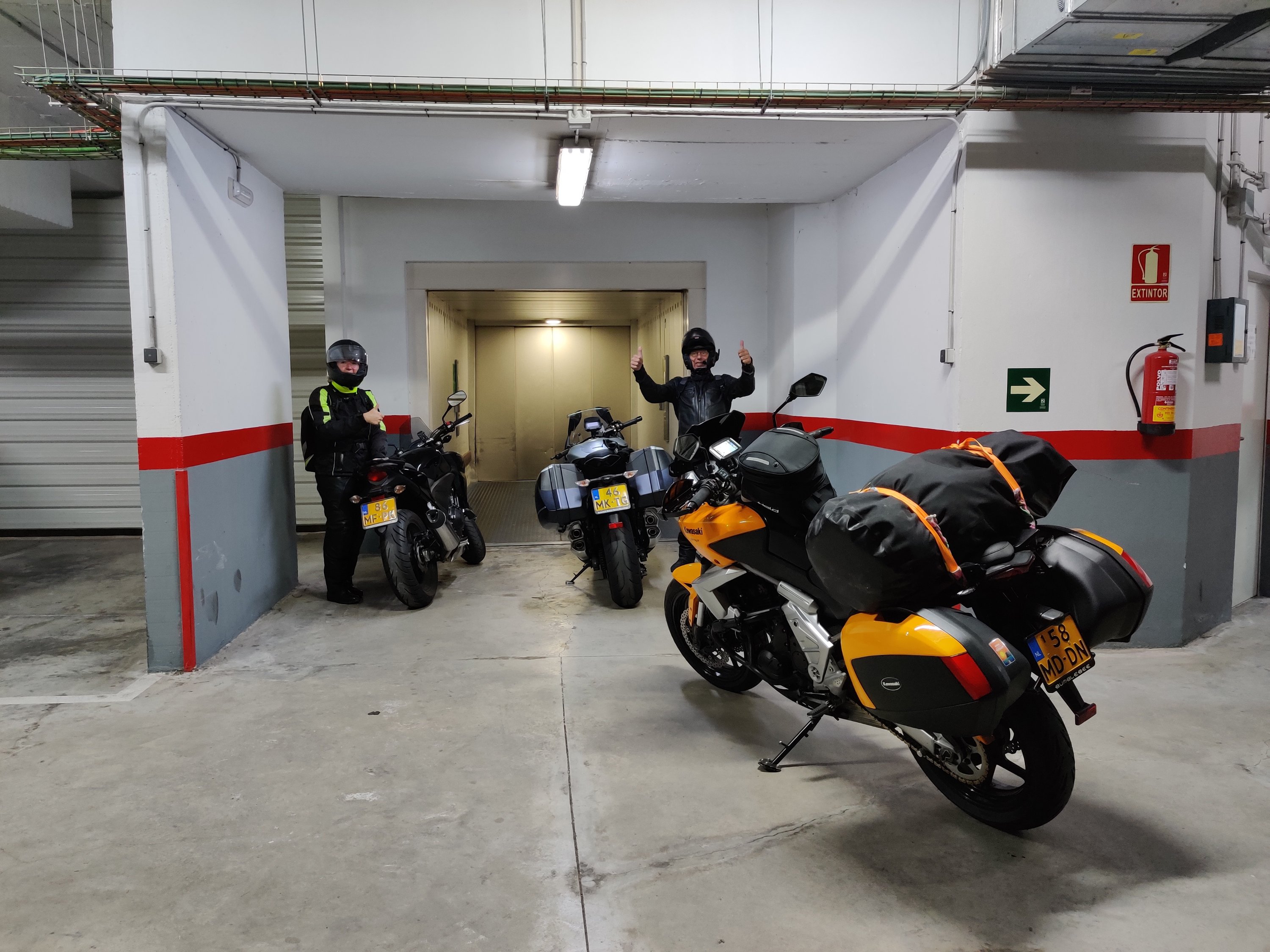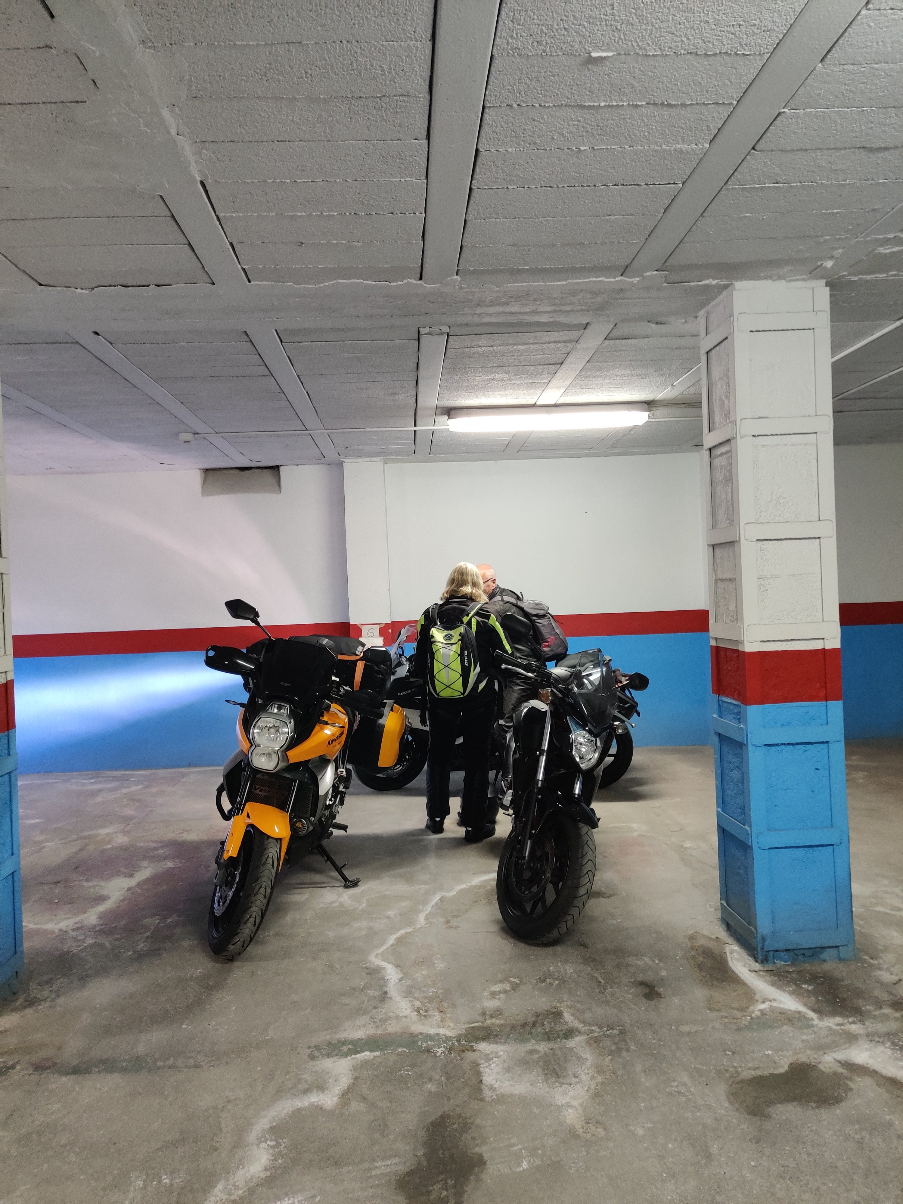 We hebben een late vlucht en slapen in een hotel vlakbij de luchthaven en de loods van NordCargo. We nemen de volgende dag een taxi naar de loods en worden weer herenigd met de motoren. Ze worden voorzichtig uit de kratten gehaald en wij pakken alle spullen over in de roltas, koffers en tanktas en kleden ons om. Een aantal zaken laten we achter in een weekendtas bij NordCargo. Ontzettend relaxte gasten, die echt voorzichtig omgaan met je motor. Vooraf heb ik alle hotels en een paar appartementen geboekt via Booking. Vaak met ontbijt wat lekker is dat je daarna direct kan vertrekken en desnoods nog wat meeneemt van het ontbijtbuffet voor onderweg. Alhoewel er onderweg vaak tentjes zijn waar je voor een prikje een goede maaltijd kunt eten. De Spanjaarden eten vaak een uitgebreide warme lunch en dan pas weer vanaf 20 -20.30 u tapas. Omdat het na het hoogseizoen is, is het onderweg niet allemaal open op de meer avontuurlijke routes. Toch zijn er vaak wel benzinepompen waar je wat kunt drinken en eten en soms hebben ze een uitgebreid wegrestaurant/terras.