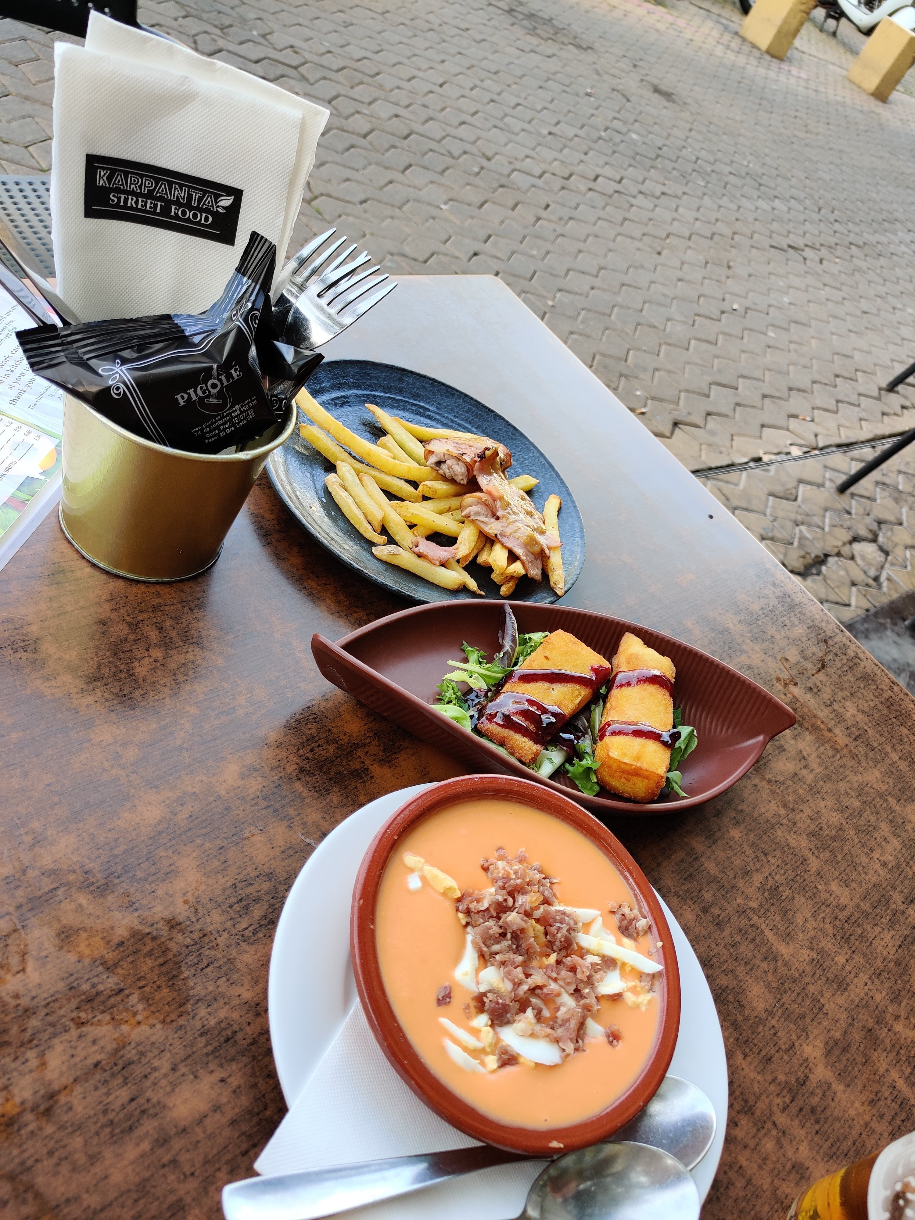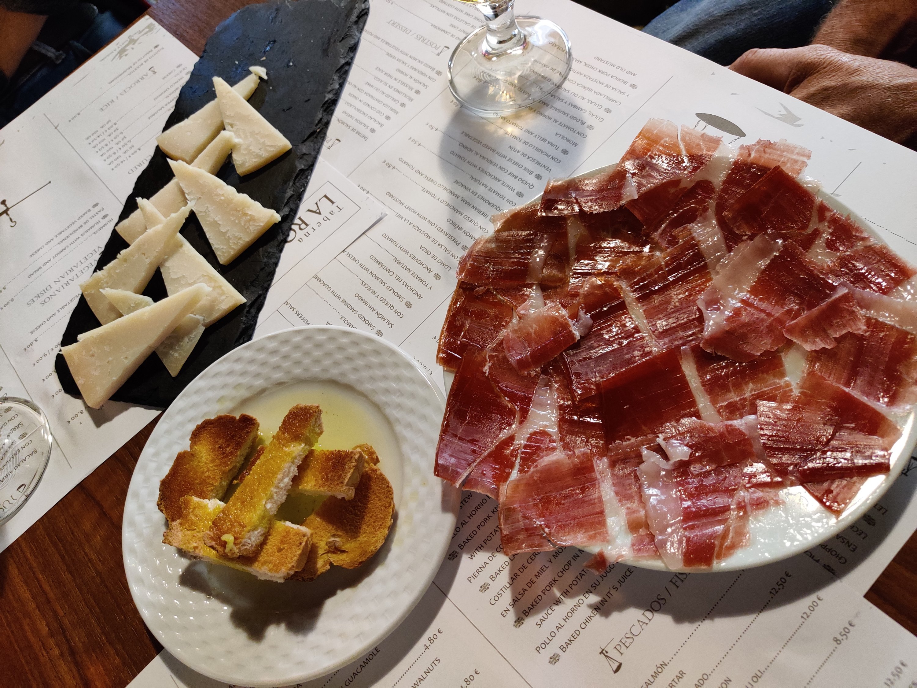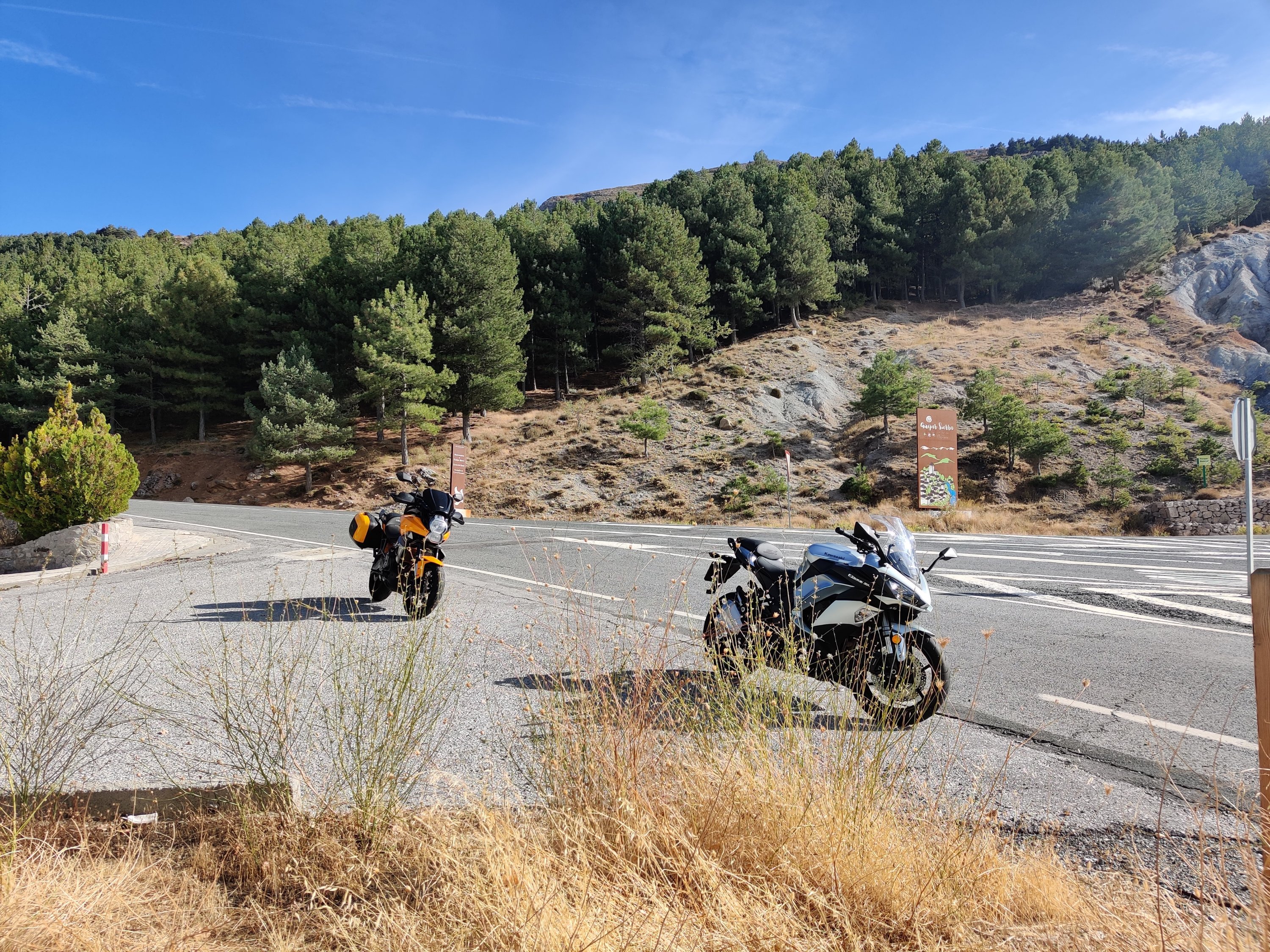 We hebben een late vlucht en slapen in een hotel vlakbij de luchthaven en de loods van NordCargo. We nemen de volgende dag een taxi naar de loods en worden weer herenigd met de motoren. Ze worden voorzichtig uit de kratten gehaald en wij pakken alle spullen over in de roltas, koffers en tanktas en kleden ons om. Een aantal zaken laten we achter in een weekendtas bij NordCargo. Ontzettend relaxte gasten, die echt voorzichtig omgaan met je motor. Vooraf heb ik alle hotels en een paar appartementen geboekt via Booking. Vaak met ontbijt wat lekker is dat je daarna direct kan vertrekken en desnoods nog wat meeneemt van het ontbijtbuffet voor onderweg. Alhoewel er onderweg vaak tentjes zijn waar je voor een prikje een goede maaltijd kunt eten. De Spanjaarden eten vaak een uitgebreide warme lunch en dan pas weer vanaf 20 -20.30 u tapas. Omdat het na het hoogseizoen is, is het onderweg niet allemaal open op de meer avontuurlijke routes. Toch zijn er vaak wel benzinepompen waar je wat kunt drinken en eten en soms hebben ze een uitgebreid wegrestaurant/terras.