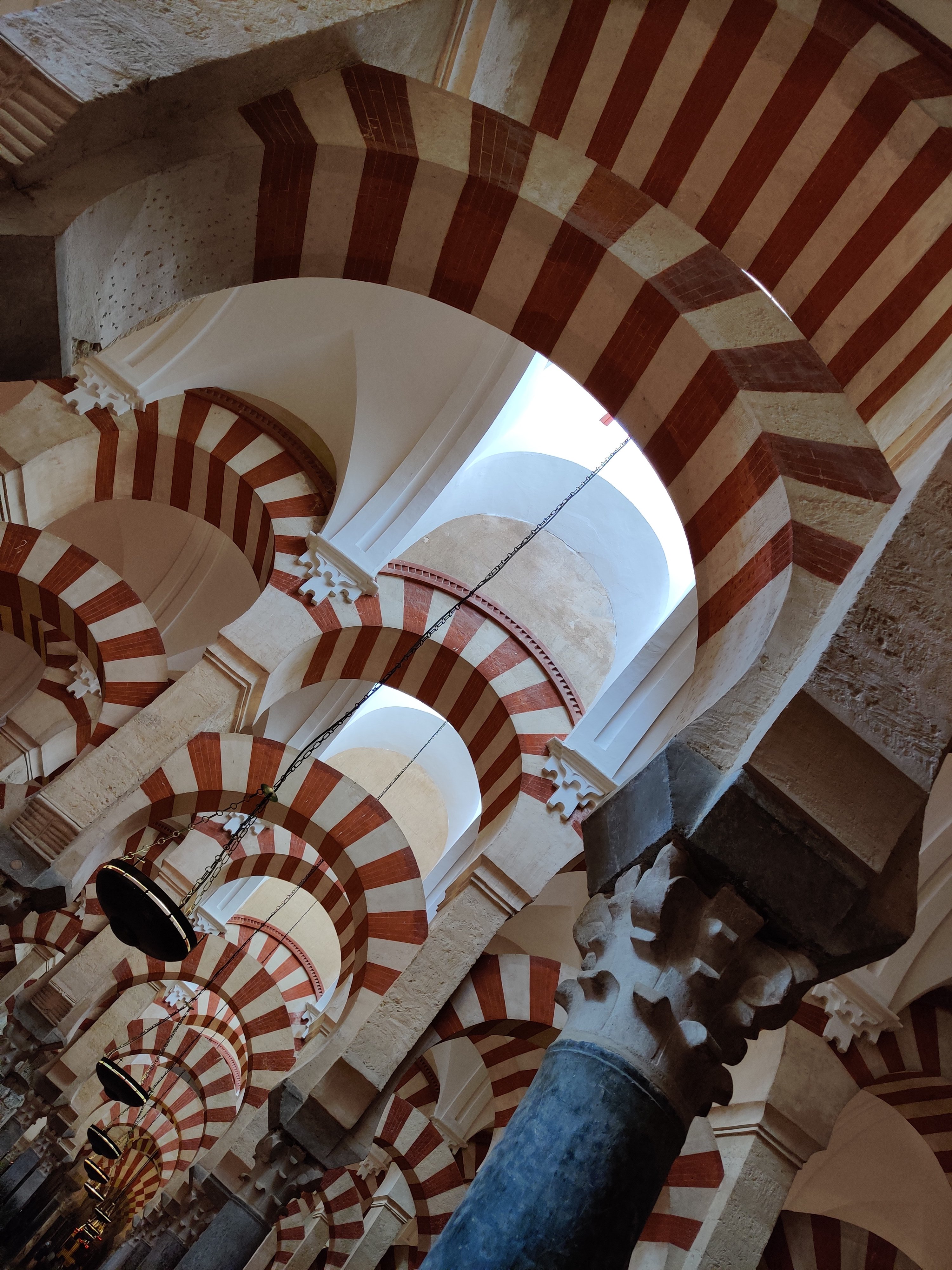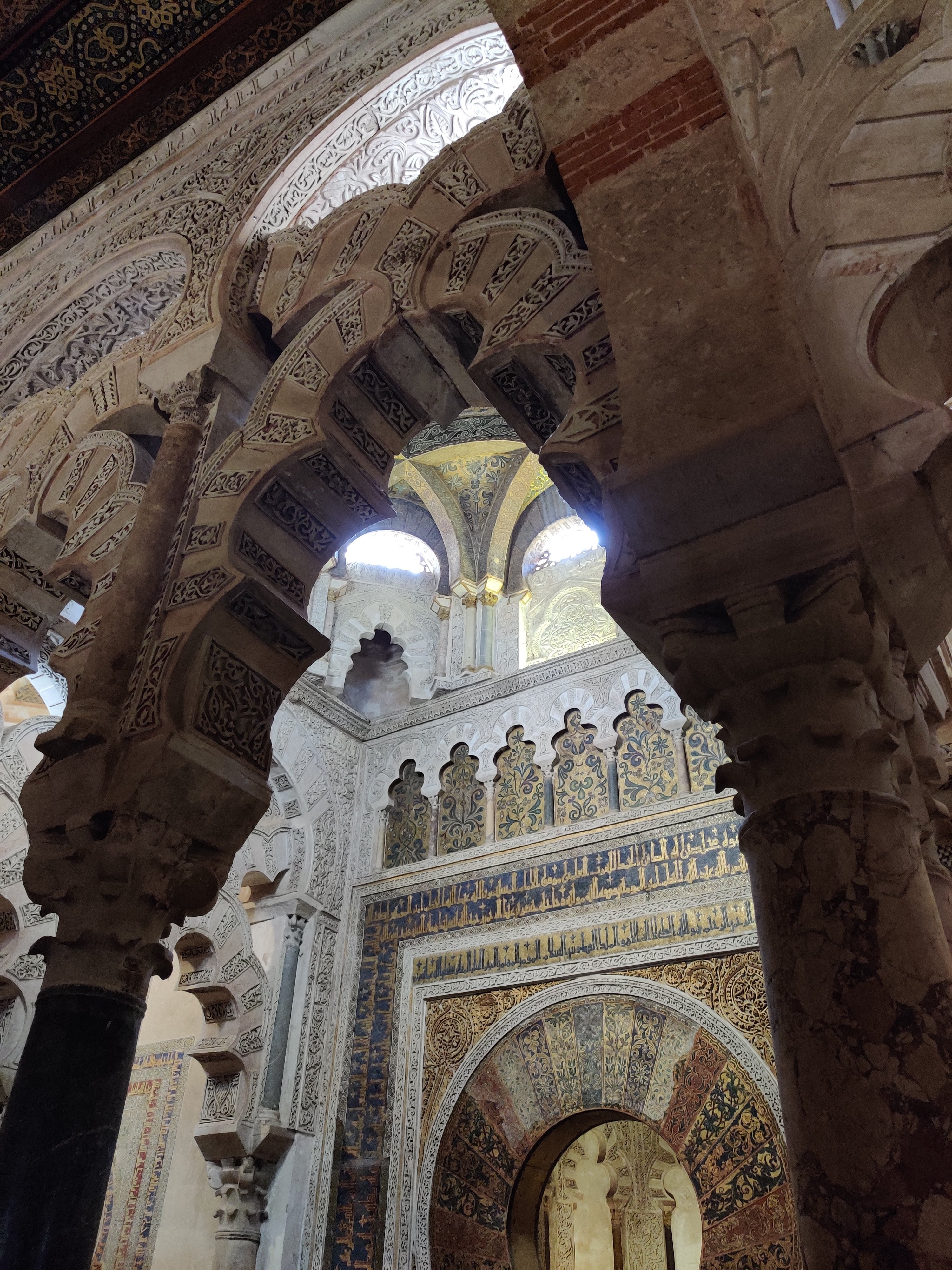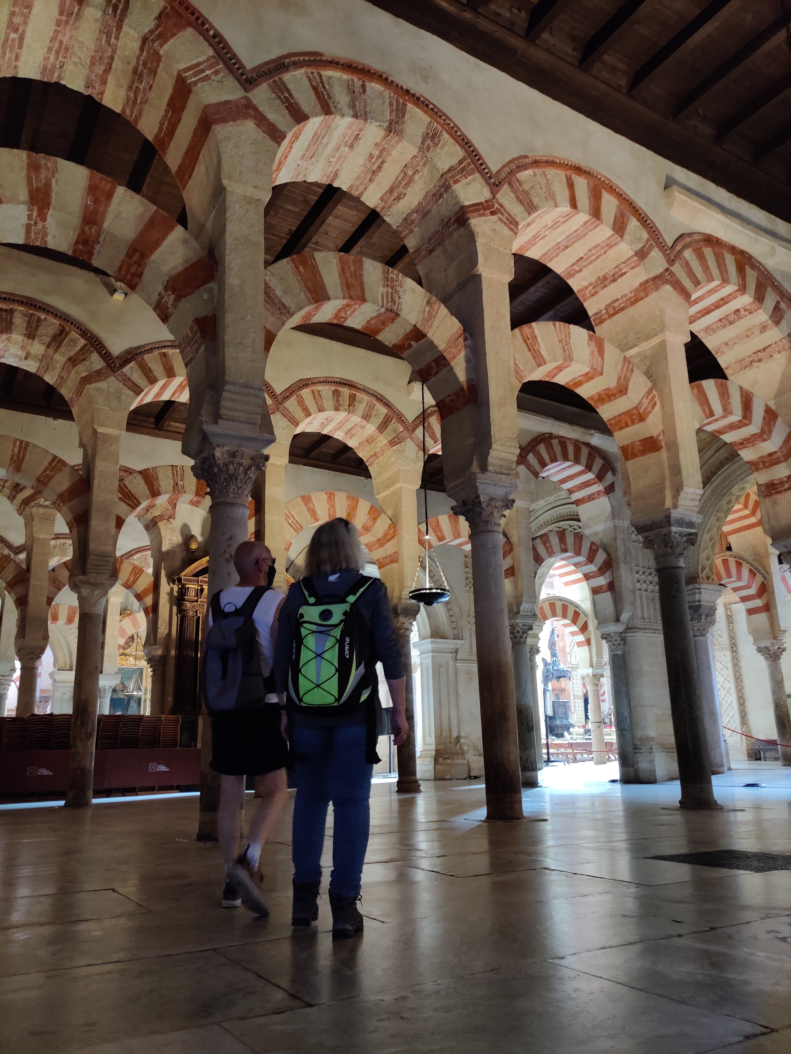 Van Granada rijden we naar Cordoba. In Cordoba hebben we een hotel met een dakterras en zwembad op het dak. Je hebt een prachtig uitzicht op de oude stad en de Romeinse brug. In Cordoba bezoeken we de hele oude Mezquita (Spaans voor moskee). Een werkelijk betoverende kathedraal die echt uniek is. Het is een kerk geweest, gebouwd op de fundamenten van een Romeinse tempel. De Moren hebben na verovering er een moskee van gemaakt en dit complex steeds verder uitgebreid, waarna sinds de Christelijke herovering het weer als kathedraal in gebruik is. Ik moet wel zeggen dat ik juist de prachtige bogen fascinerend vond en de Christelijke nissen erg protserig en kitscherig. De bogen deden me denken aan Escher zijn figuren. En dat is grappig, want later lees ik dat Escher diep onder de indruk was van dit gebouw. Ik snap het wel, je blijft kijken naar de herhaling, de kleuren en vormen. Een schitterende mihrab (gebedsnis) in een muur is erg sprookjesachtig. In de middag bezoeken we ook nog de tuinen van het Alcazar de los Reyes Cristianos.