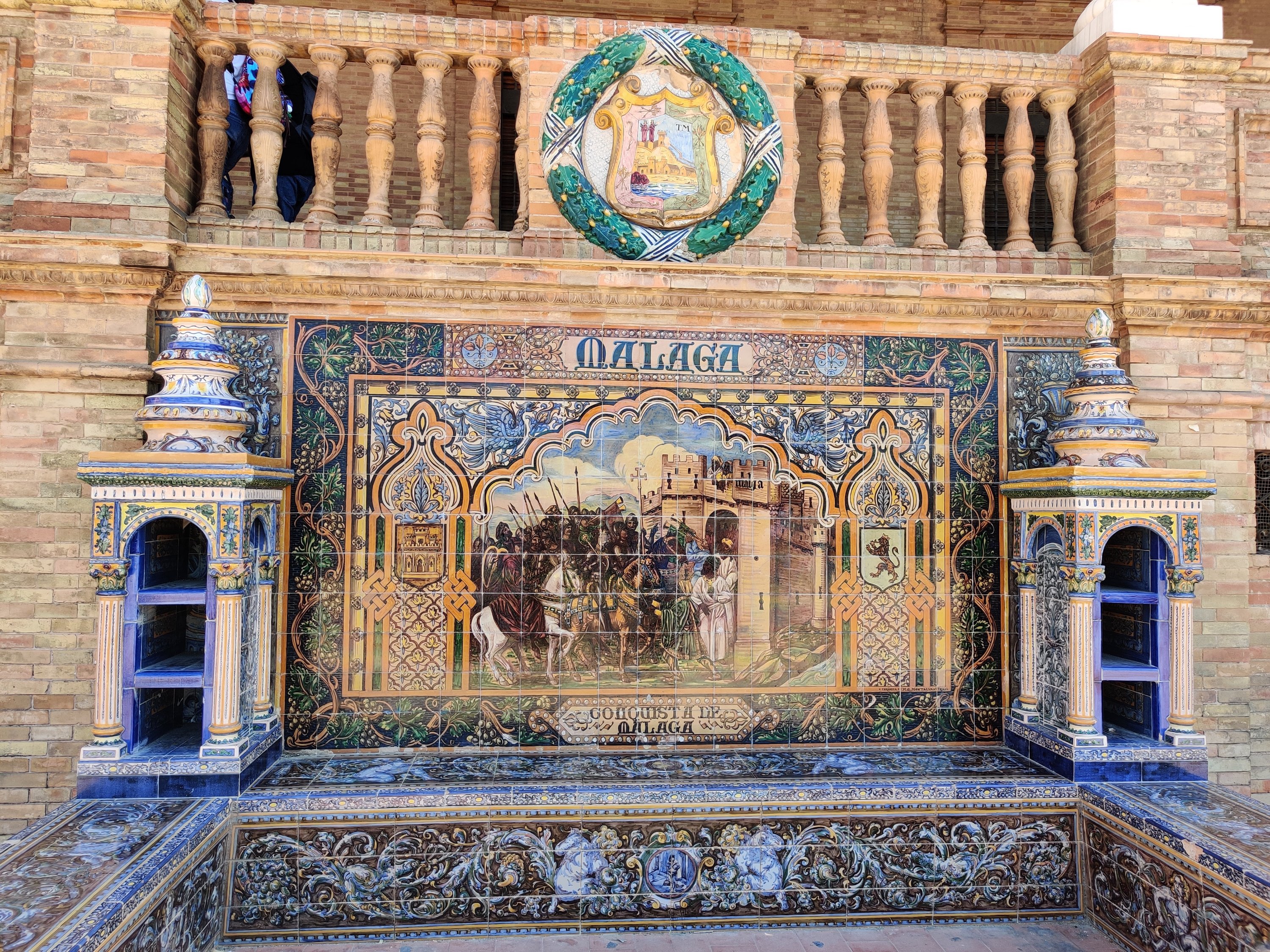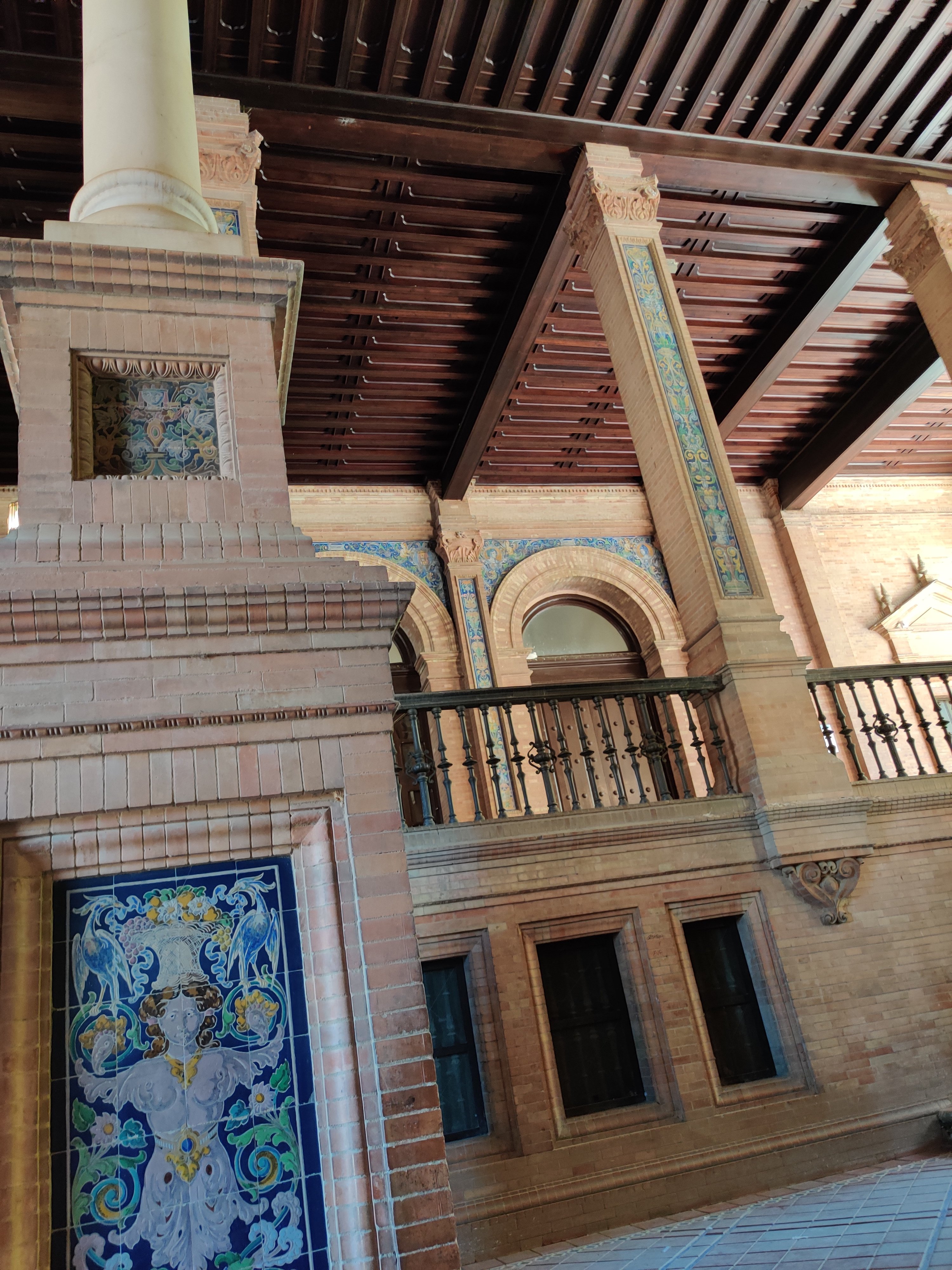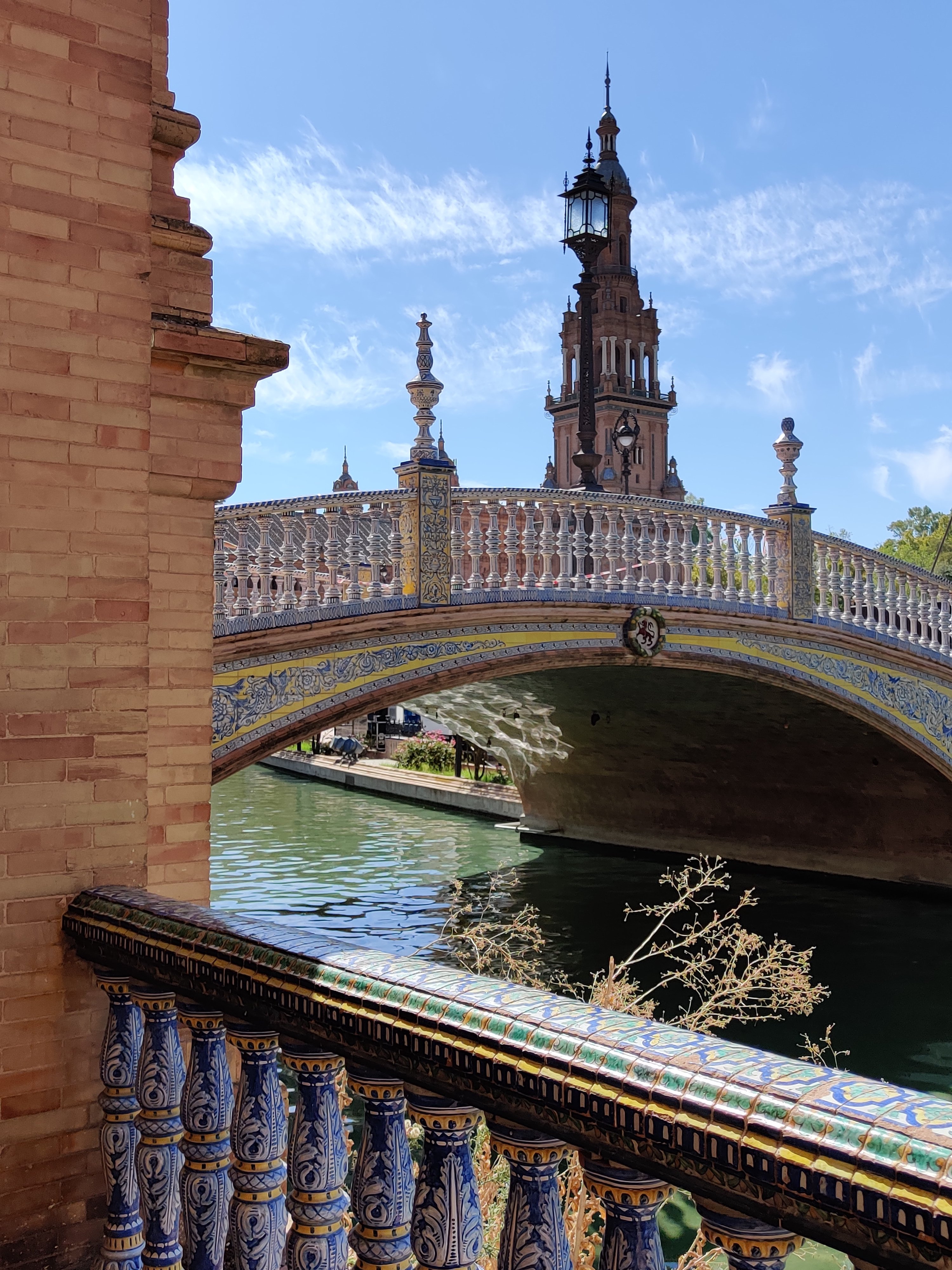 Na Cordoba rijden we naar de warmere stad Sevilla. We moeten even zoeken naar de parkeergarage Escuelas Pias want door wat wegafsluitingen zonder duidelijke omleiding, moeten we met onze navigaties even zoeken hoe we naar de parkeergarage komen en rijden dwars door de stad over smalle keienweggetjes. De parkeergarages lijken steeds steiler te worden en deze is heel erg steil. Pa en ik zetten de motoren beneden en daarna gaan we met een taxi naar het appartement. Het is een heerlijk koel appartement in een superstil hofje vlakbij La Alameda. Je loopt zo een terrasje op en zit heerlijk in het zonnetje. In Sevilla pakken we een taxi en starten bij het Plaza Espana. Als we het park inlopen, staan twee Flamenco danseressen te dansen. Een mooi gezicht. Het zonlicht door de bladeren werpt een mooi licht op de danseressen. We wandelen in een rustig tempo terug naar het appartement via allerlei highlights. De rijen zijn enorm en de kaartjes voor die dag uitverkocht. Jammer, maar we hebben al zoveel gezien aan moois in de andere steden, dat het ook lekker is om nu gewoon door de stad te wandelen en lekker mensen te kijken.
