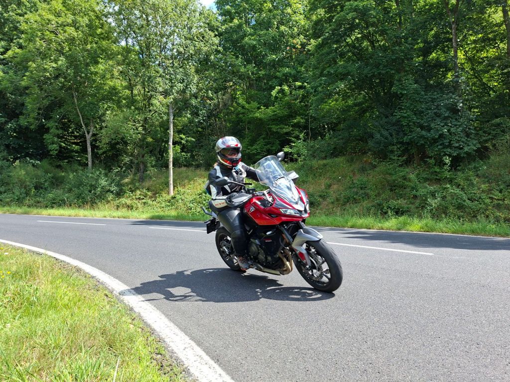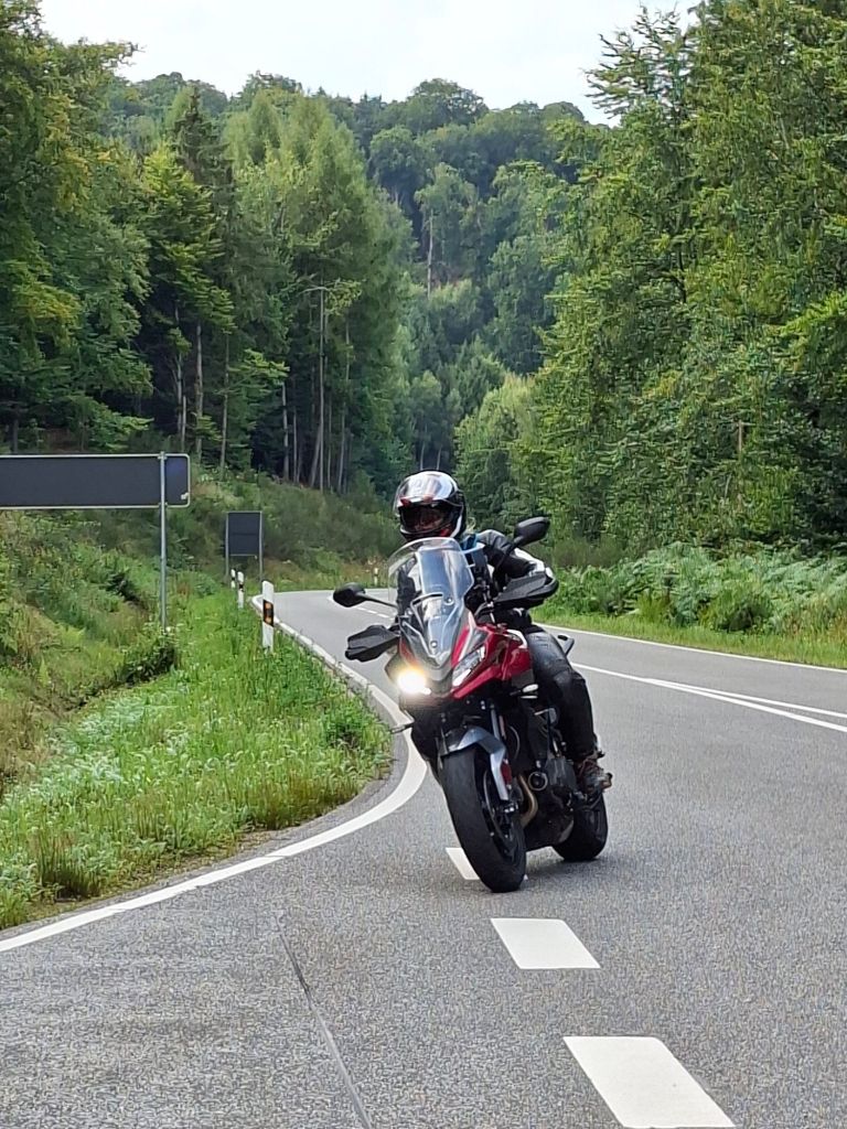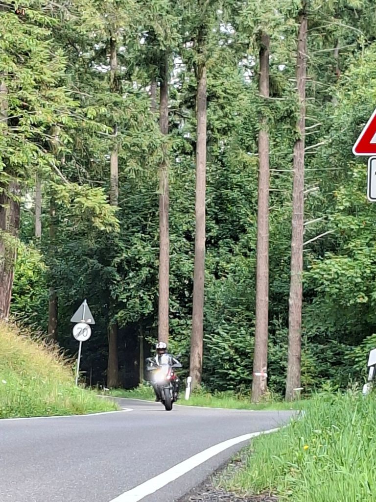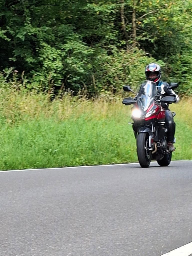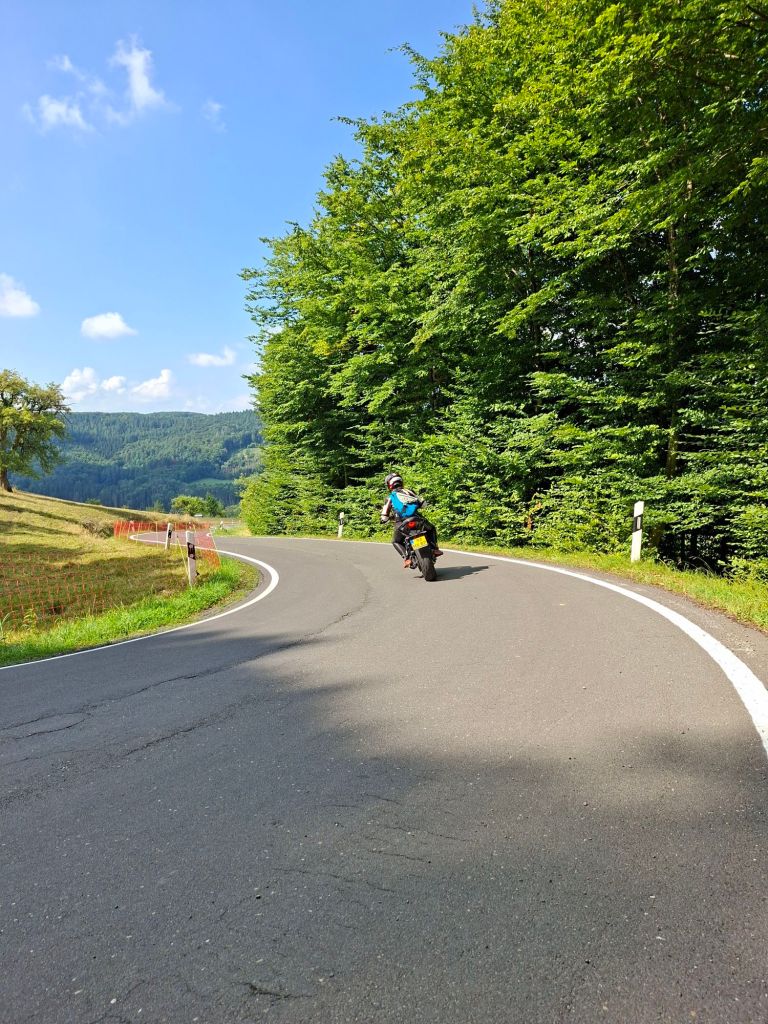 Na de hangbrug toeren we weer over waanzinnige wegen terug naar Jan. Wat weer een heerlijke rijdag was dit. Razende reporter Arno rijdt me regelmatig zoek om dan weer ergens in een bocht actiefoto’s te maken. Sommige stukjes rijden we nog een keer zo leuk of om een foto te maken van een mooi uitzicht op de Moezel. We zitten nog heerlijk op het terras bij Jan met een cola en biertje, voordat we gaan eten in het gezellige café.