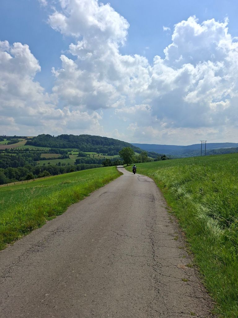 De volgende dag is het prachtig weer en gaan we heerlijk toeren met een route van Jan die door Luxemburg gaat, nadat we Frans hebben uitgezwaaid. Wat is het genieten door de glooiende korenvelden, weilanden en heerlijk geurende bossen. De wegen zijn mooi en slingeren omhoog en naar beneden door pittoreske dorpjes met uitzicht op verschillende kastelen en burchten.