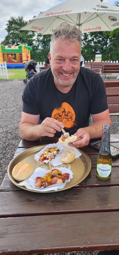Bij de brug is een aparte parkeerplaats voor motoren waar je ook je spullen in een kluis kan doen. Er is een terras met toilet waar we lunchen met een Currywurst, voordat we gaan wandelen. Met een softijs na als toetje bij een foodtruck achter het terras. Wat een feestje!